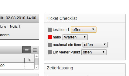 Mit dieser Erweiterung können Sie TODO-Listen/Checklisten für Ihre Tickets erstellen. Dazu gibt es im Ticketmenü einen Punkt "Checklist".